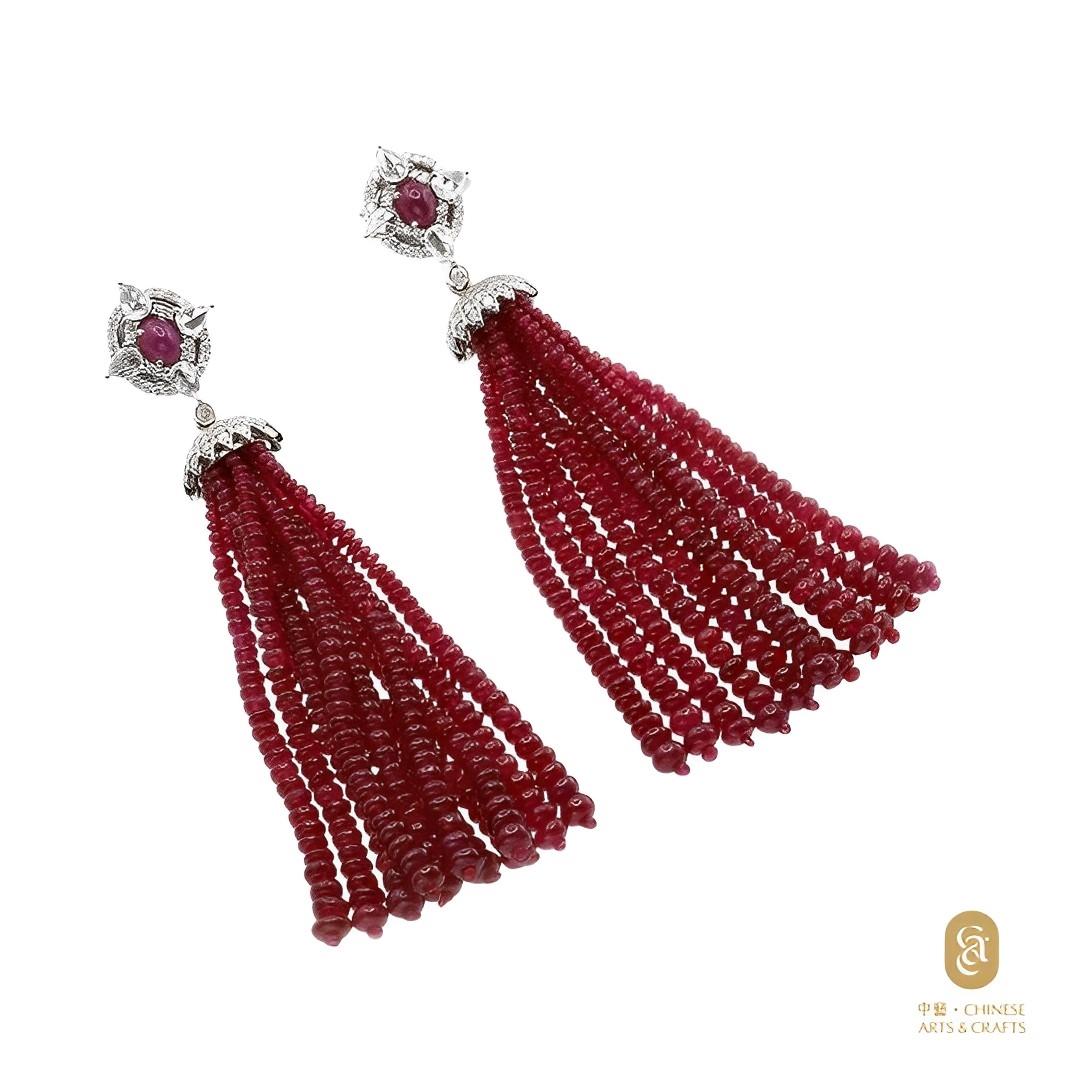 18K白色黃金鑲鑽石配紅寶石流蘇形耳環