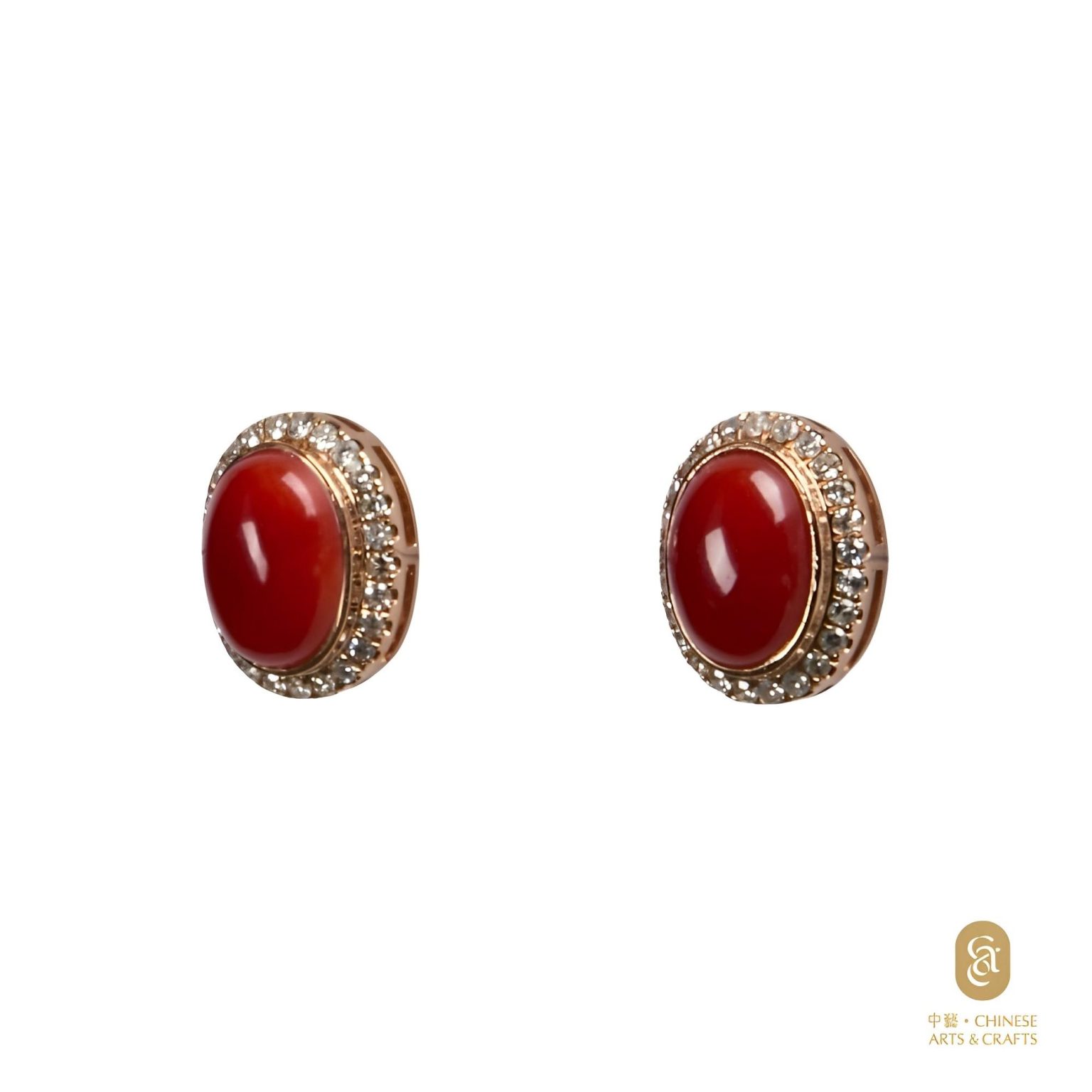 18K玫瑰金鑲紅寶石 鑽石耳環
