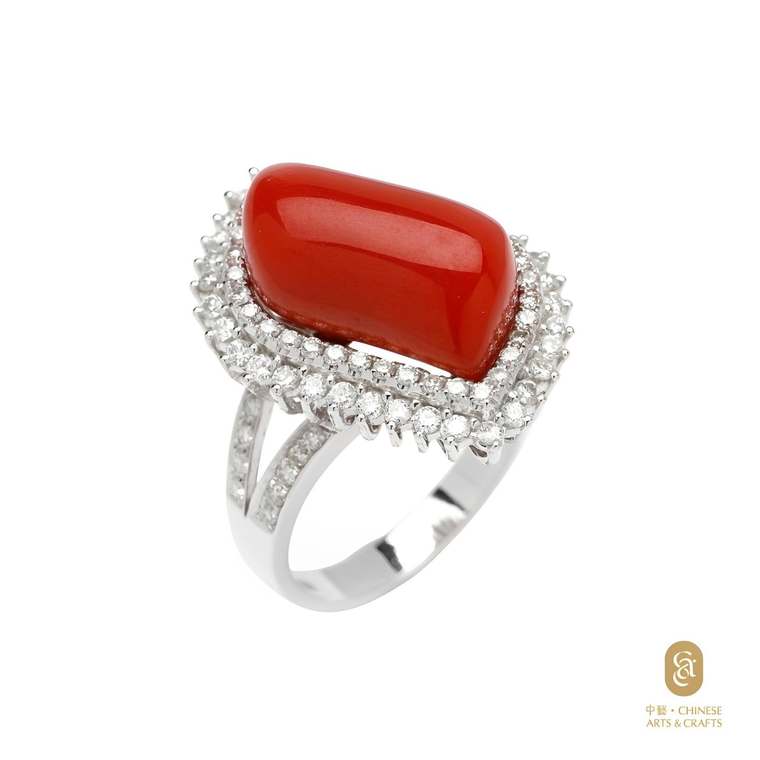 18K白色黃金珊瑚鑽石戒指