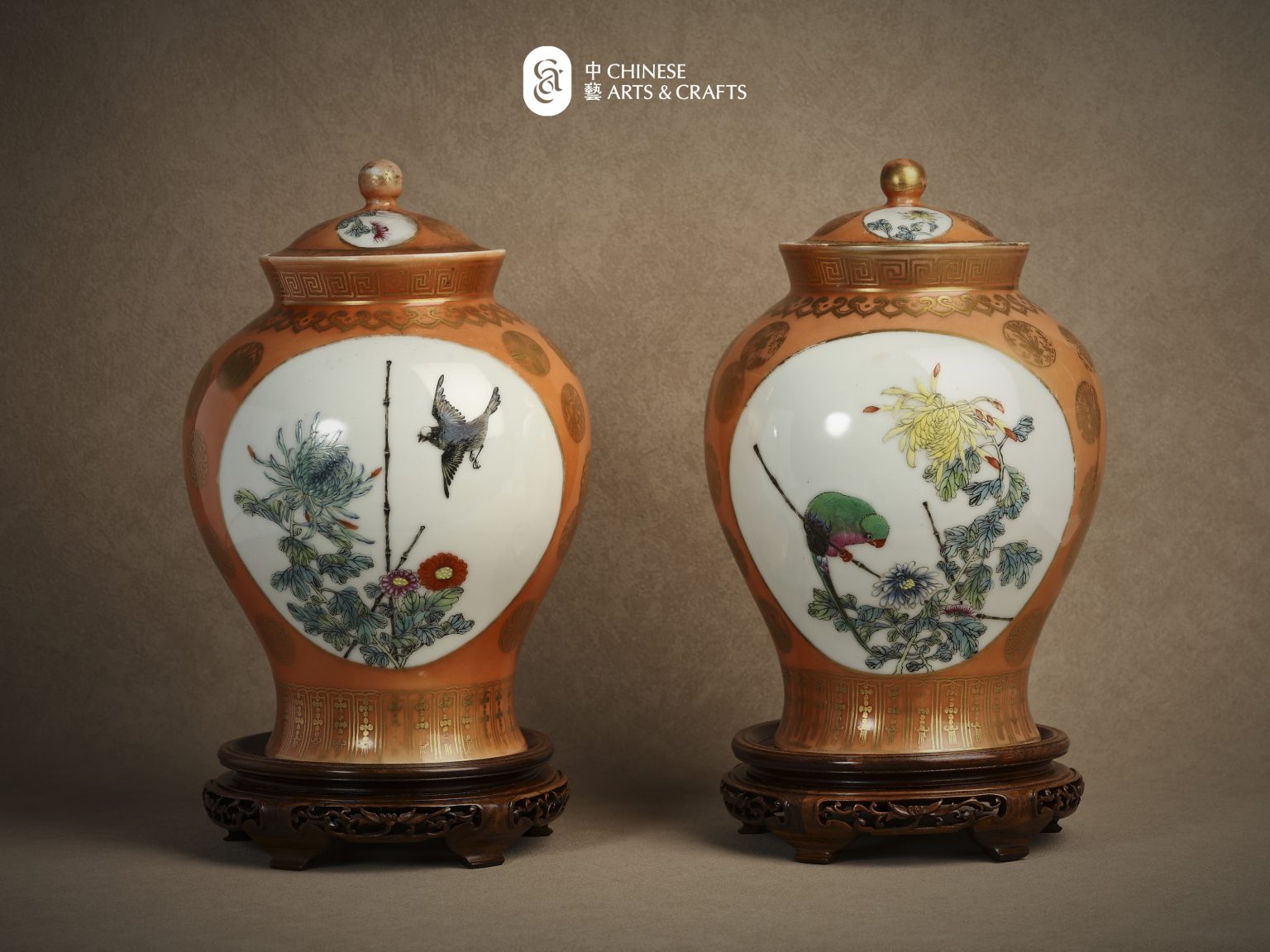 光緒珊瑚紅描金開窗花鳥紋蓋罐