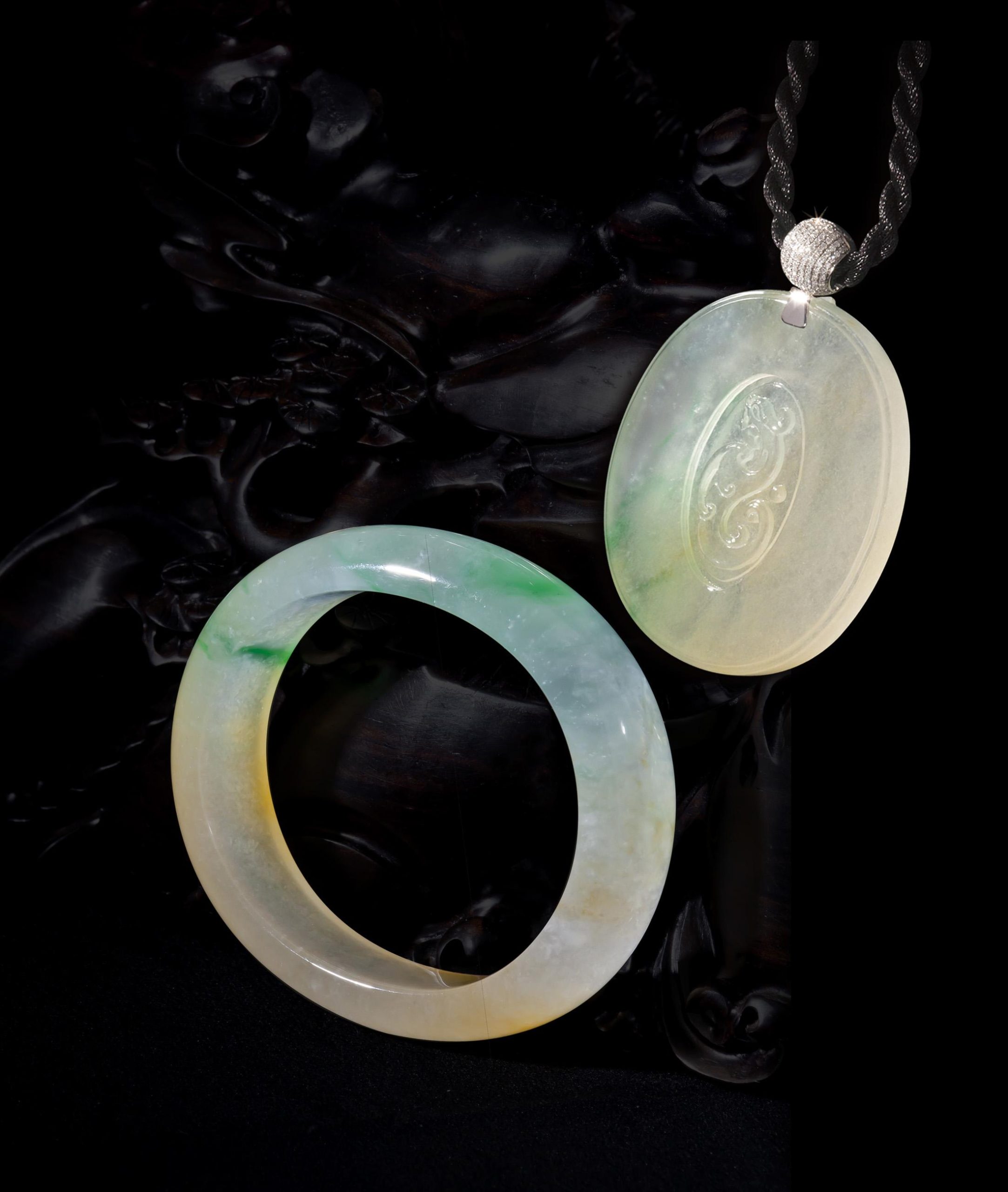 天然翡翠(A玉)三彩貴妃福鐲/如意橢圓牌 92.71g