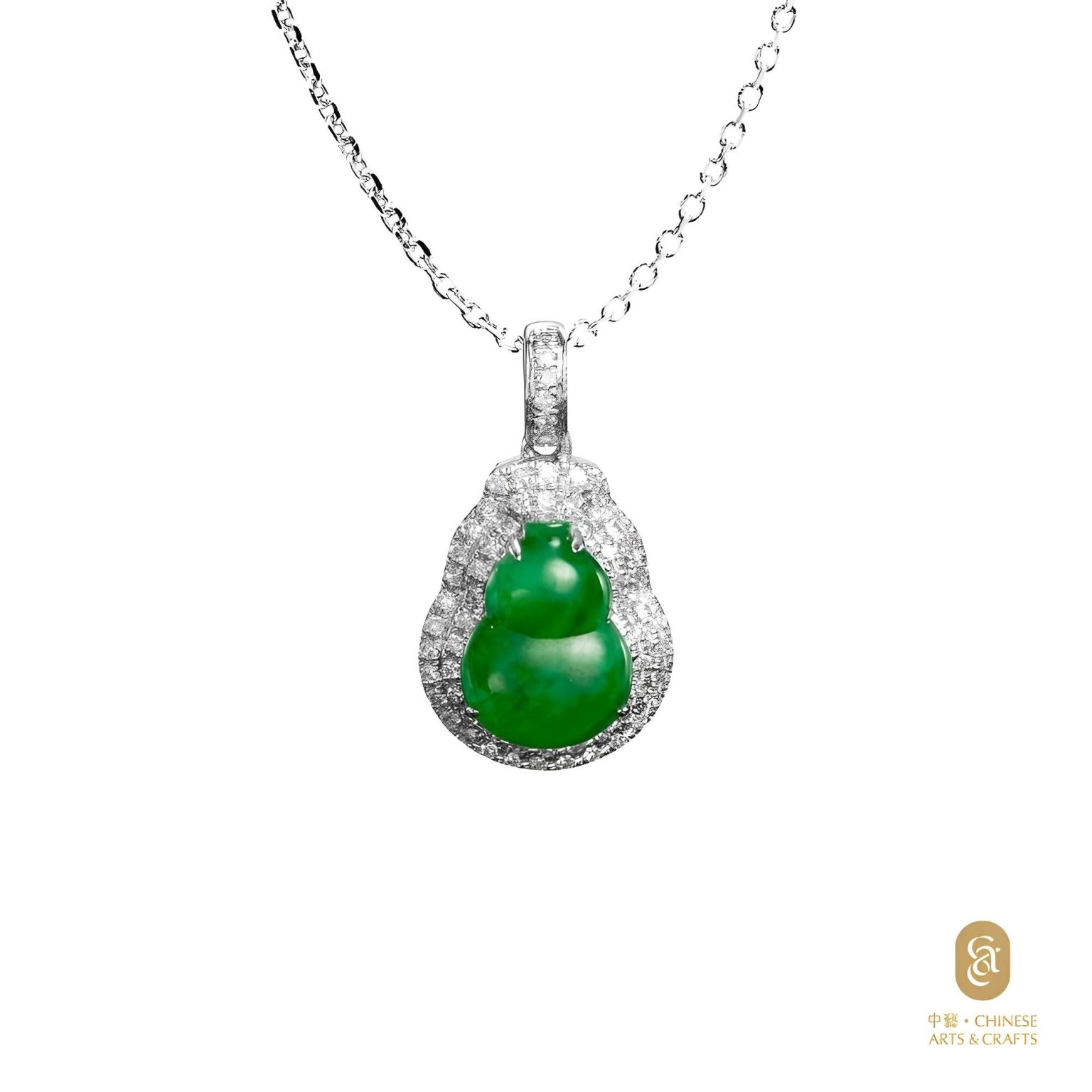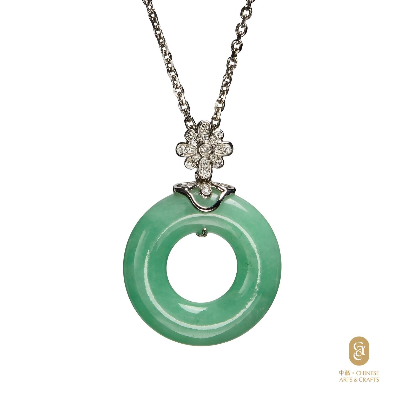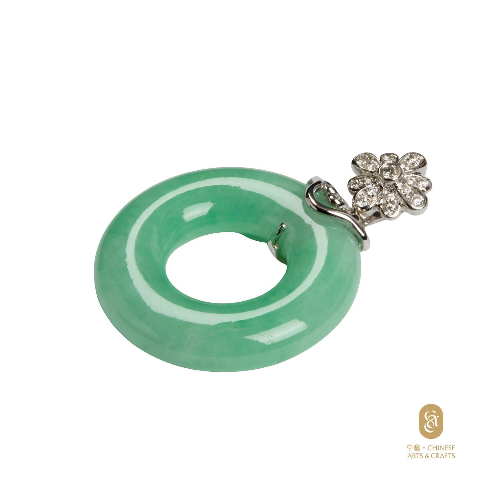產品材質:天然翡翠(A玉);18K白色黄金鑲鑽石重量(約) :3.97g產品尺寸:長20mm*高28mm*闊4mm;D:0.088CT