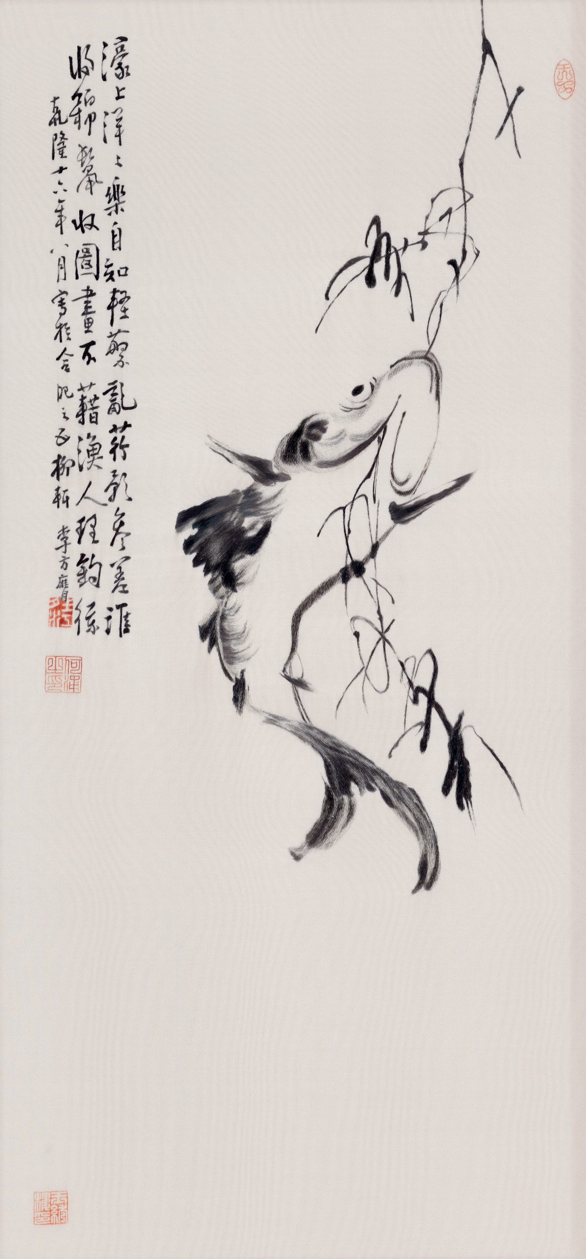 此幅「錦鬣圖」刺繡掛屏,以清代「揚州八怪」之一李方膺傳世水墨畫作為藍本,棄筆墨而取針線,化水韻為絲光,於絹帛之上重現揚州畫派獨有的寫意精神與淋漓生氣。作品不囿於原作的紙本水墨,而是憑藉絲線的天然光澤與肌理,將一尾遊魚的靈動、水草的飄搖、墨色的枯濕濃淡,演繹出另一種溫潤而深邃的維度。這不僅是技藝的移植,更是對「離形得似」寫意美學的一次絲繡闡釋。