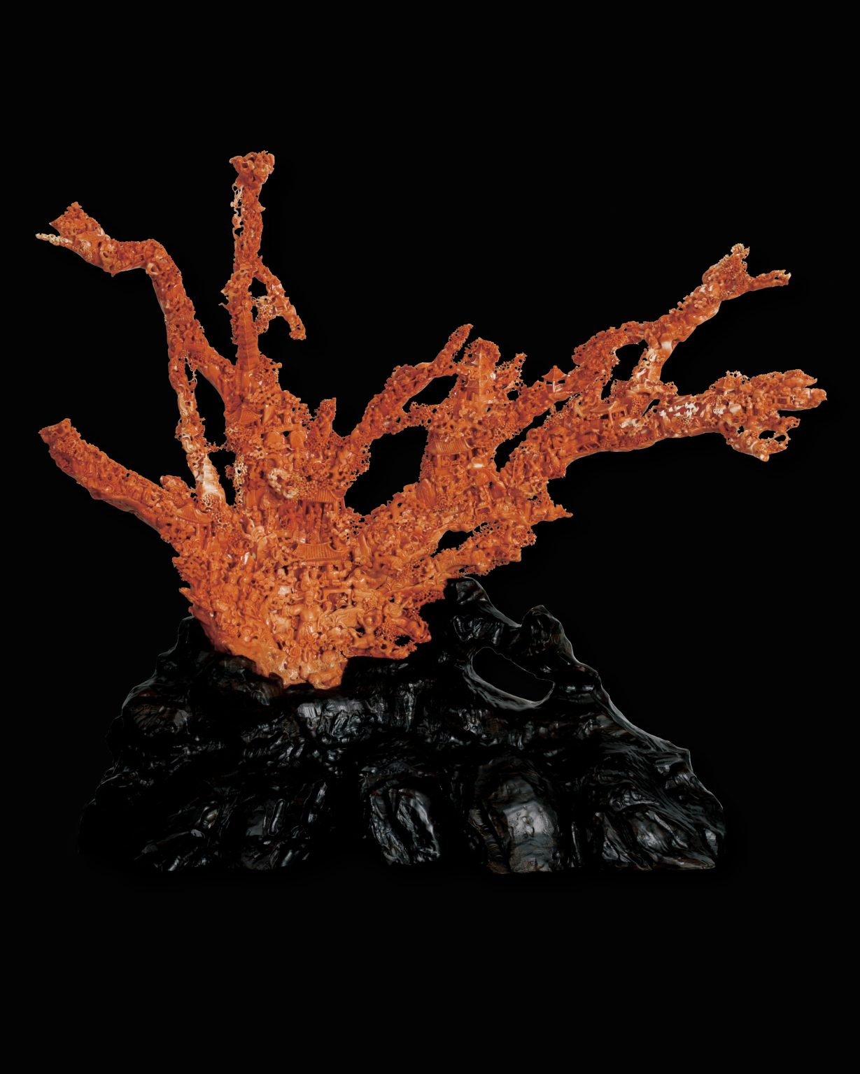 當萬年深海的靈枝,邂逅人間煙火的盛景,便成就了這一座「滿城吉慶」珊瑚大型山景——將深海珊瑚的天然形魄,化為一座可遊、可觀、可居的祥瑞仙山。整作以整株罕見大型珊瑚為骨,其枝杈盤虯伸展,天然形成層巒疊嶂、溝壑幽深之態,再施以精妙佈局與鬼斧雕工,於峰迴路轉間,鋪陳出一幅萬類歡欣、山海同慶的盛世長卷。