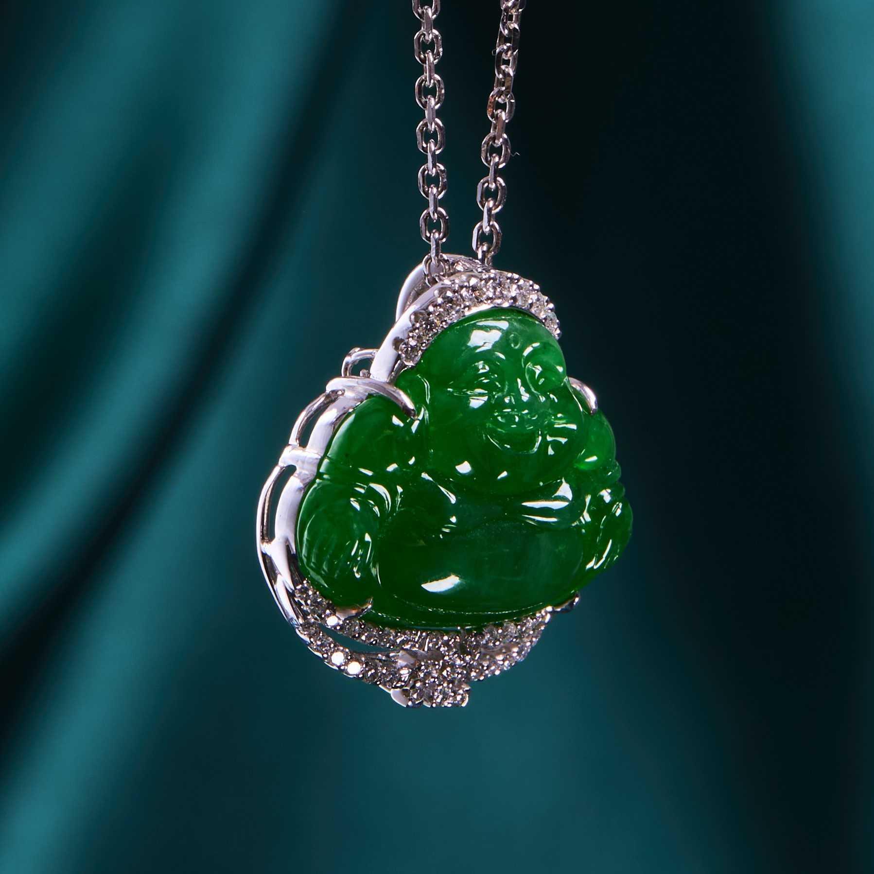 18K白色黃金鑲鑽石天然翡翠(A玉)佛公吊墜 8.5g